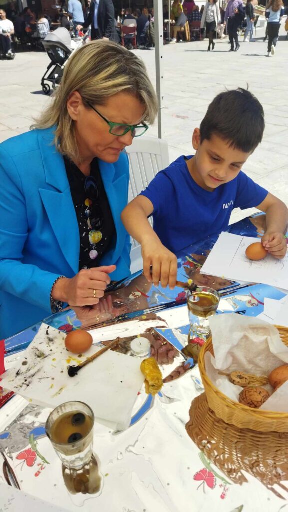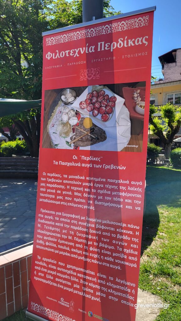Με μεγάλη επιτυχία πραγματοποιήθηκε την Κυριακή των Βαΐων, το 1ο ανοιχτό βιωματικό εργαστήρι “περδίκας” του Δήμου Γρεβενών στην κεντρική πλατεία της πόλης, όπου τα μέλη και οι φίλοι του Τμήματος Παραδοσιακών Χορών, αναβίωσαν, τις “Πασχαλινές Περδίκες”, τα μοναδικά “κεντημένα” με λιωμένο μελισσοκέρι πασχαλινά αυγά των Γρεβενών, που αποτελούν μικρά έργα τέχνης της λαϊκής μας παράδοσης.