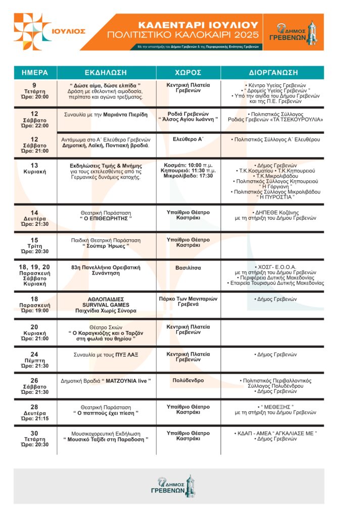 Για τον Δήμο Γρεβενών αποτελεί προτεραιότητα η ανάπτυξη ενός πολιτιστικού κινήματος, με την ενεργή συμμετοχή της Νέας Γενιάς και ιδιαίτερα των μαθητών, των πολιτών και των Πολιτιστικών Συλλόγων και φορέων της πόλης μας. Στο πλαίσιο αυτό, το Πολιτιστικό Καλοκαίρι 2025, περιλαμβάνει ποικίλες εκδηλώσεις, που εκφράζουν τις αισθητικές αναζητήσεις της κοινωνίας, αλλά ταυτόχρονα δίνουν την δυνατότητα στους συμπολίτες μας να απολαύσουν στιγμές χαράς και ψυχαγωγίας.