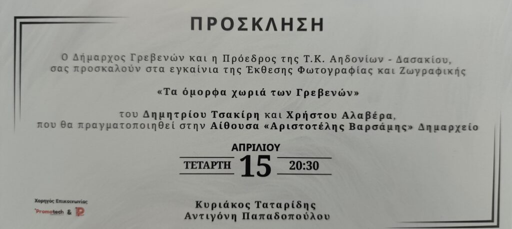 Ο Δήμος Γρεβενών (Αντιδημαρχία Πολιτισμού) και η Τοπική Κοινότητα Αηδονιών – Δασακίου σας προσκαλούν στην Έκθεση Φωτογραφίας και Ζωγραφικής με τίτλο «Τα όμορφα χωριά των Γρεβενών: Ο τόπος και οι άνθρωποι», μια καλλιτεχνική αποτύπωση της αυθεντικής ομορφιάς, της καθημερινότητας και της πολιτιστικής ταυτότητας της περιοχής.