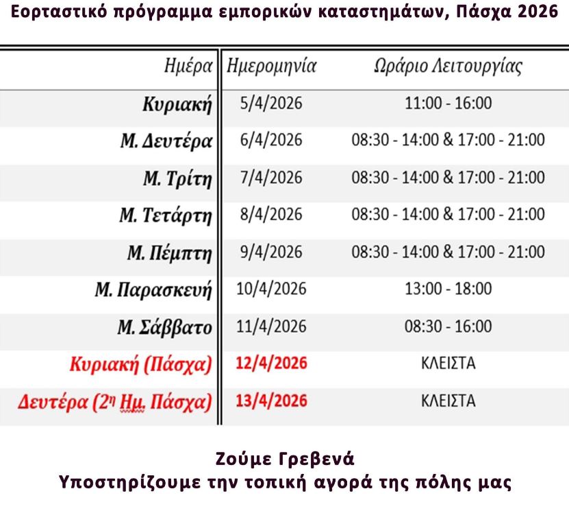 Εορταστικό Πρόγραμμα Εμπορικών Καταστημάτων Πάσχα 2026