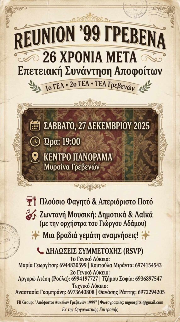 Με μεγάλη χαρά και νοσταλγία, η οργανωτική επιτροπή της τάξης του 1999 καλεί όλους τους συμμαθητές και τις συμμαθήτριες σε μια ξεχωριστή επετειακή συνάντηση . Η εκδήλωση θα πραγματοποιηθεί το Σάββατο 27 Δεκεμβρίου 2025, ώρα 19:00, στο Κέντρο Πανόραμα, στη Μυρσίνα Γρεβενών.