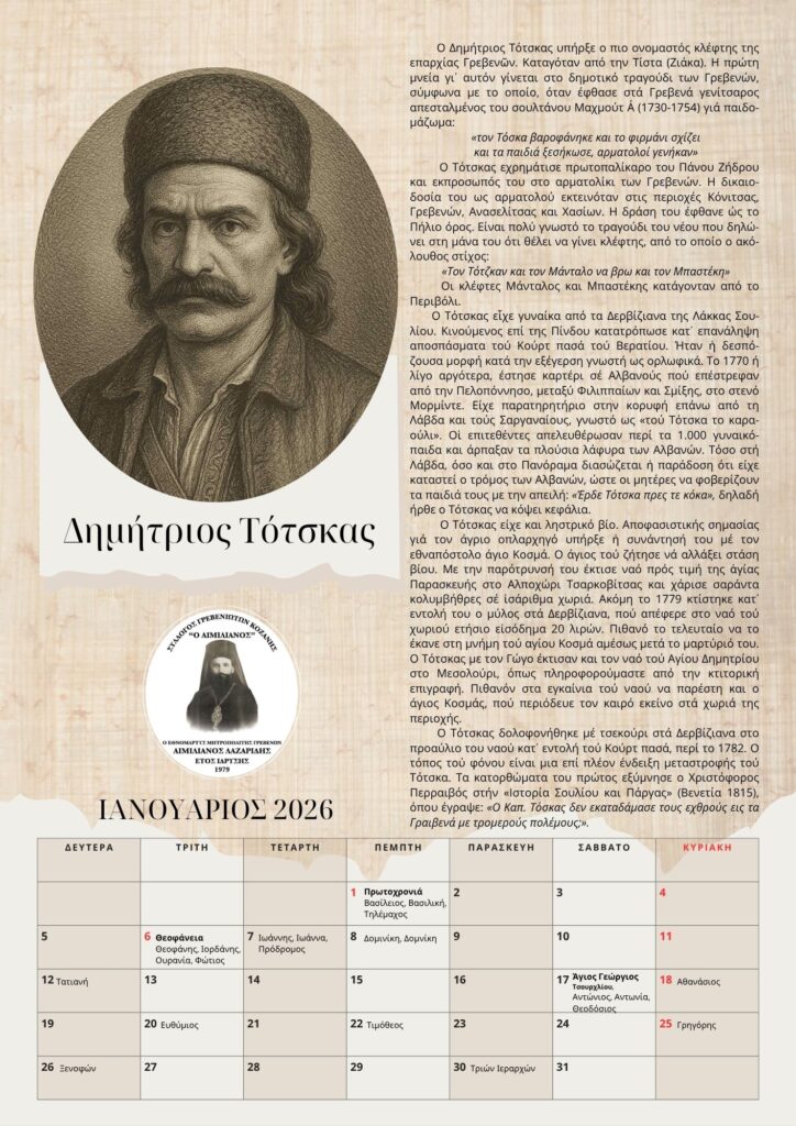 Το ημερολόγιο 2026 είναι ένα μεγάλο συλλεκτικό ημερολόγιο τοίχου, αποτελείται από 13 σελίδες μεγέθους Α3 και περιλαμβάνει 12 ιστορικές προσωπικότητες με φωτογραφία και βιογραφικό (αρχείο Ιστορικού Ερευνητή και Συγγραφέα κ. Παπαδημητρίου Απόστολου), που διαδραμάτισαν σημαντικό ρόλο στην περιοχή των Γρεβενών.