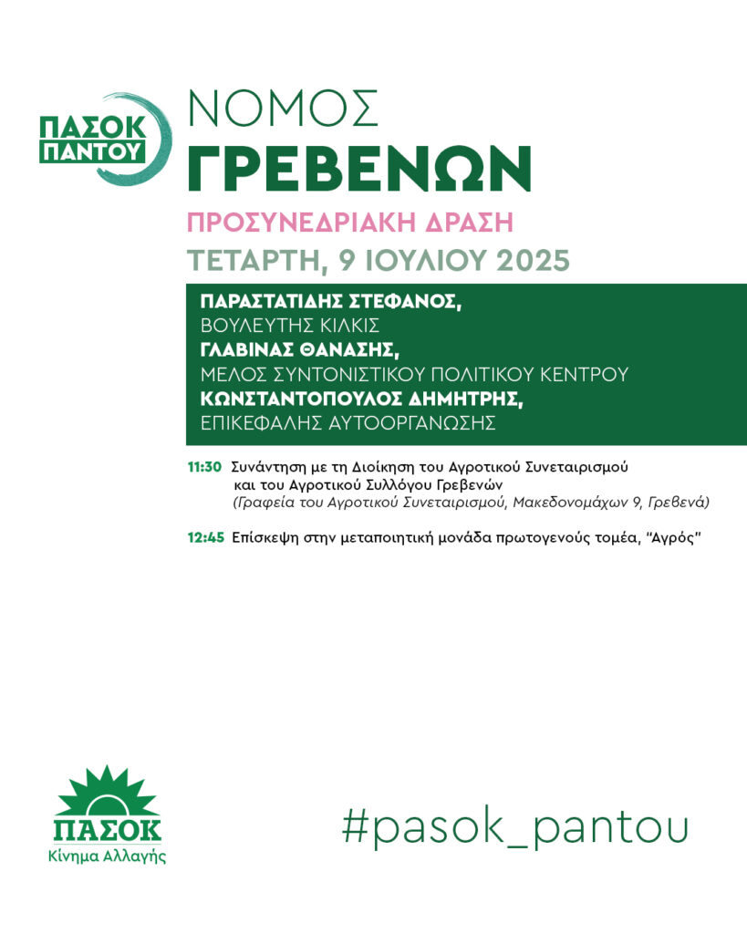 Τριμελές κλιμάκιο στελεχών του ΠΑΣΟΚ θα βρίσκεται στα Γρεβενά την Τετάρτη 9-9-2025 στις 11.00 το πρωϊ.