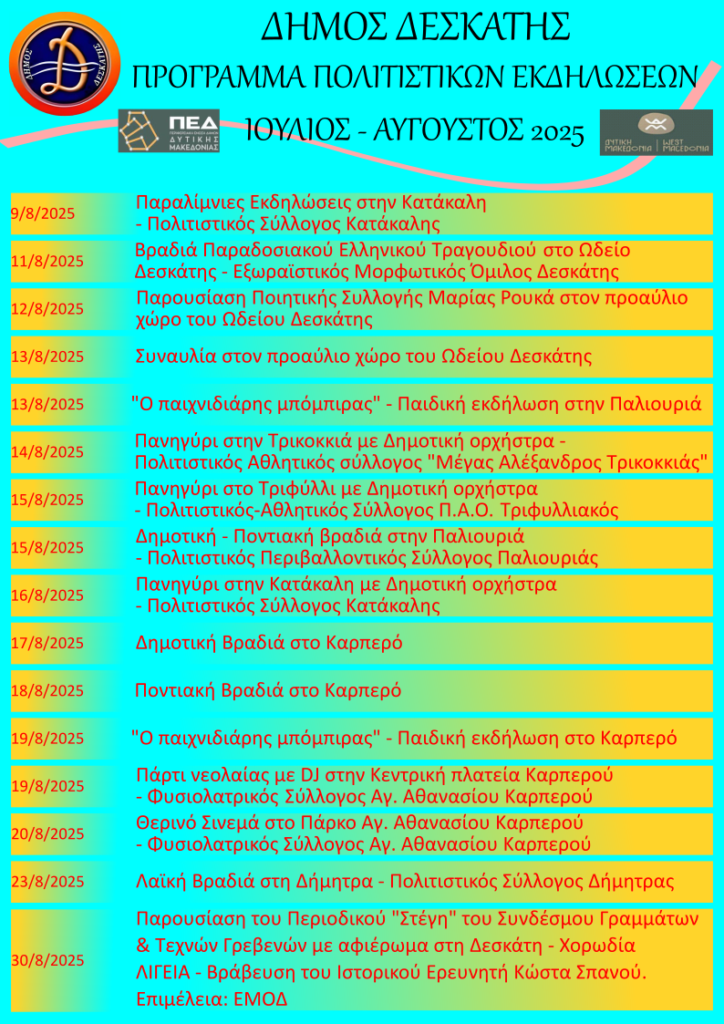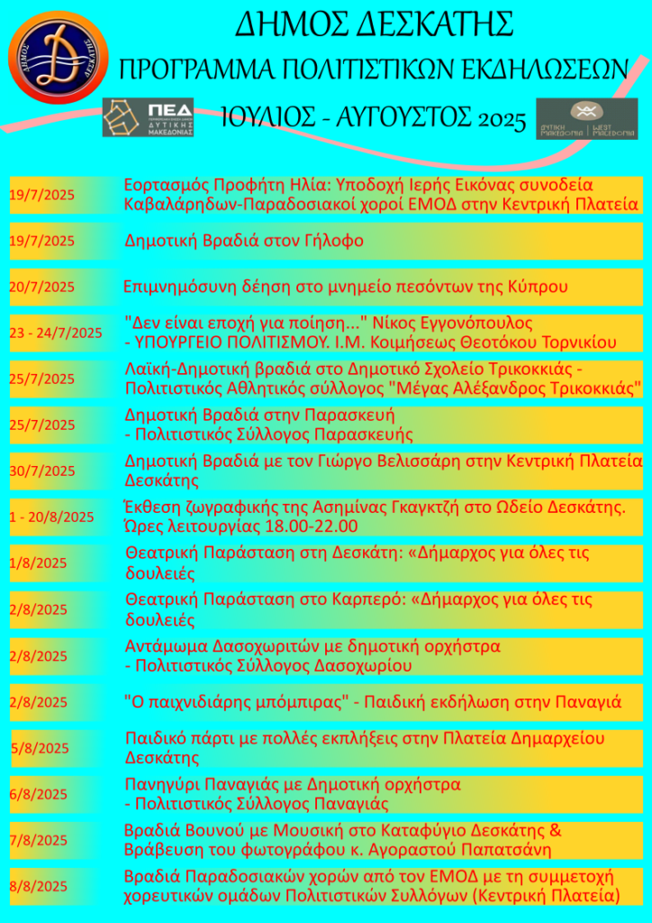 Γρεβενά Πολιτιστικά Πρόγραμμα πολιτιστικών εκδηλώσεων Δήμου Δεσκάτης, Ιούλιος – Αύγουστος 2025 16/07/2025 - 10:50