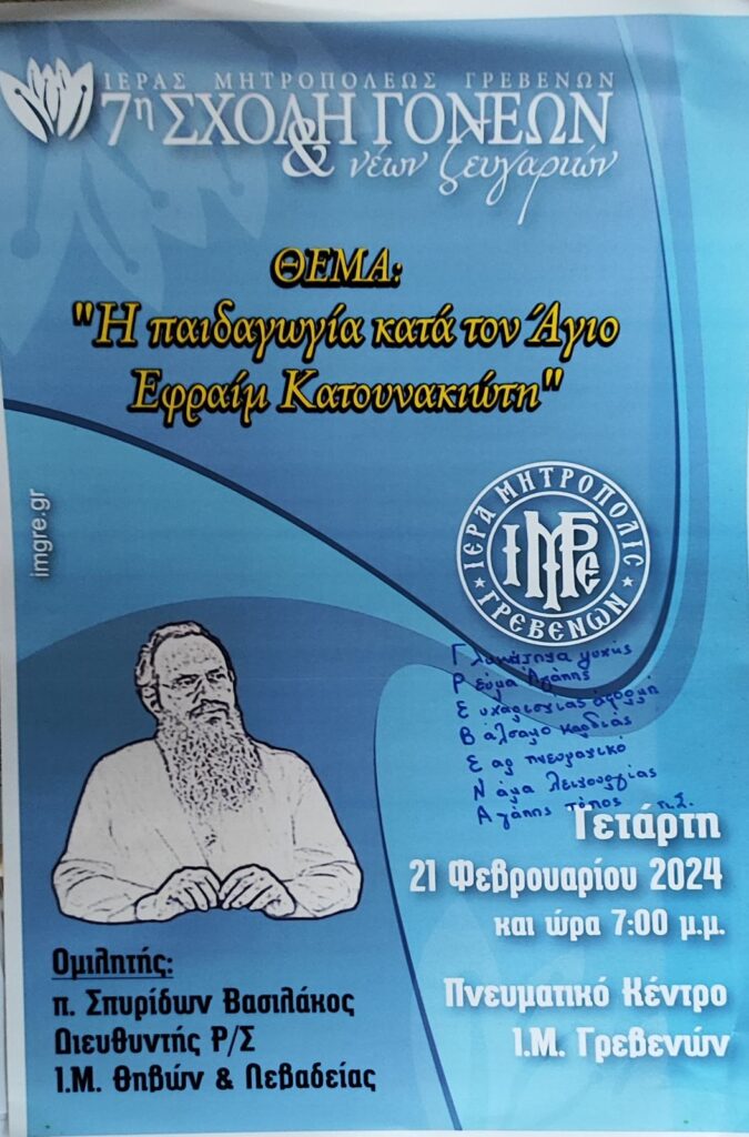 “Η Παιδαγωγία κατά τον Άγιο Εφραίμ τον Κατουνακιώτη” ήταν το θέμα που ανέπτυξε στην Σχολή Γονέων & Νέων Ζευγαριών της Ι.Μ. Γρεβενών την Τετάρτη 21 Φεβρουαρίου 2024, στο Πνευματικό Κέντρο της Μητροπόλεώς μας, π. Σπυρίδωνα Βασιλάκο, εφημέριο του Ιερού Προσκυνηματικού ναού Ευαγγελιστού Λουκά Θηβών και υπευθύνου του Εκκλησιαστικού Ραδιοφώνου της Μητροπόλεως Θηβών & Λεβαδείας. Ο καλεσμένος, που έζησε αρκετά καλά και από κοντά τον άγιο Εφραίμ, ξεκίνησε λέγοντας πως: «συχνά ψάχνουμε την παιδαγωγία στους αγίους και λησμονούμε πως η παιδαγωγία των αγίων ήταν το βίωμά τους που μύριζε από το Άγιο Πνεύμα. Οι σύγχρονοι άγιοι ως παιδαγωγοί εκείνο που μπορούν να προσφέρουν είναι ο αληθινός άνθρωπος, γιατί είχαν αντικρίσει τον αληθινό Θεό. Μέσα από τον Θεό έβλεπαν τον κάθε άνθρωπο, ως κάτι ιδιαίτερο, κάτι που σήμερα δεν συμβαίνει και γι’ αυτό δεν συναντιούνται ποτέ οι άνθρωποι. Αντίθετα, οι άγιοι έβλεπαν ως ξεχωριστό πλάσμα κάθε άνθρωπο, και γι’ αυτό παιδαγωγούν σωστά. Βάζοντας τον ‘Χριστώ εν τω μέσω ημών’ τότε επικοινωνούν με τον άλλο με κάθε τρόπο. Η παιδαγωγία των πατέρων είχε σταθερότητα, υπομονή, θυσία, ταπείνωση. Οι άγιοι δεν άφηναν ποτέ τον άνθρωπο, γιατί γνώριζαν πως όταν αφήνεις τον άνθρωπο, αφήνεις και τον Θεό. Έψαχναν πάντα να βρουν αυτά που τους ενώνουν με τους ανθρώπους και όχι αυτά που τους χωρίζουν. Εν τέλει, παιδαγωγία είναι η αγάπη, η καθαρότητα, η ειρήνη, που κρύβεται και αντικατοπτρίζεται στην ζωή των αγίων».