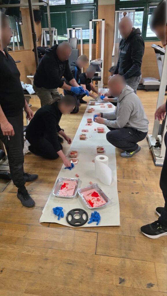 Οι συμμετέχοντες εκπαιδεύτηκαν σε τεχνικές ελέγχου σοβαρής αιμορραγίας και στη σωστή εφαρμογή ιμάντων ισχαιμικής περίδεσης (tourniquet) από έμπειρους εκπαιδευτές της Άμεσης Δράσης Θεσσαλονίκης.