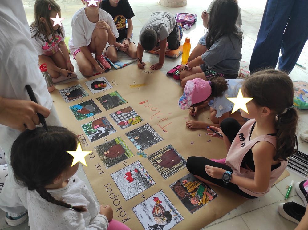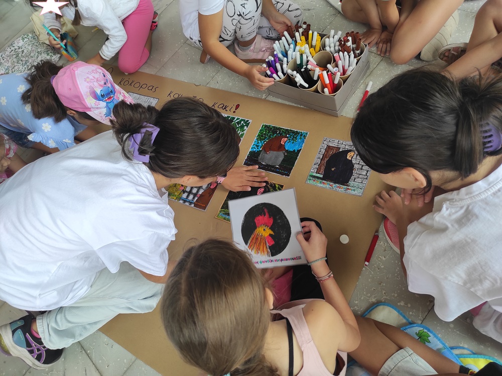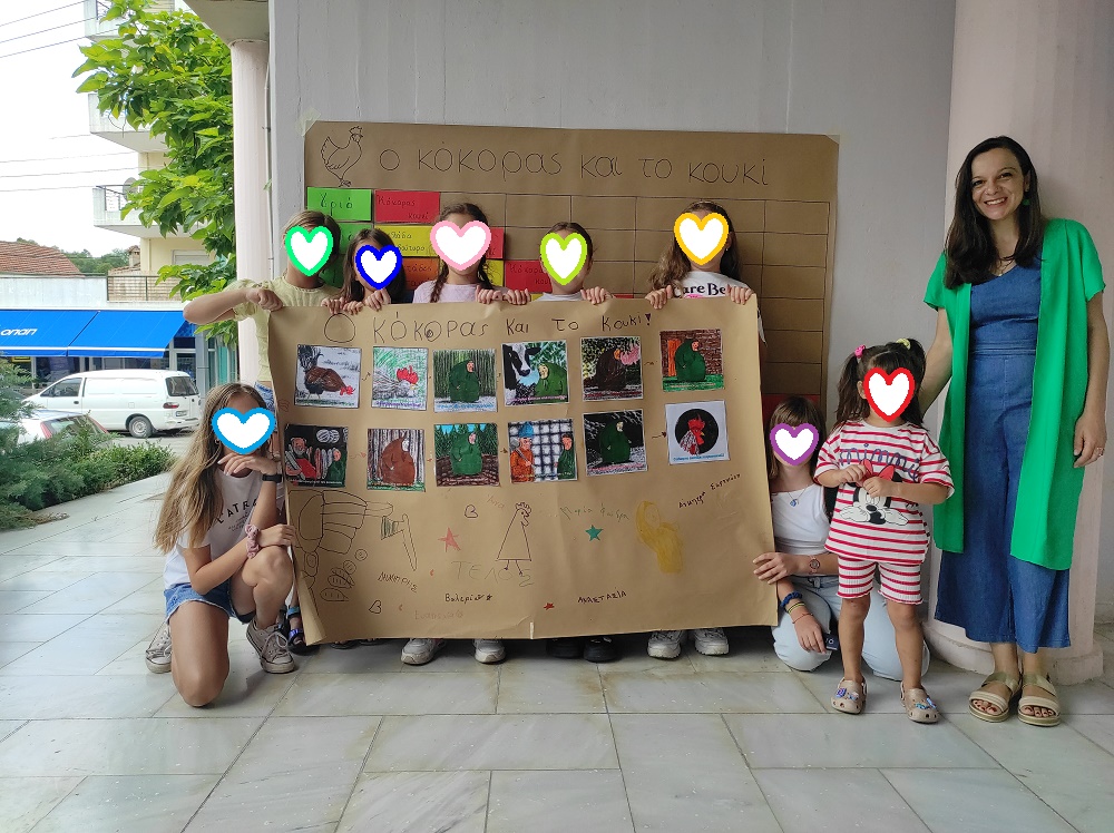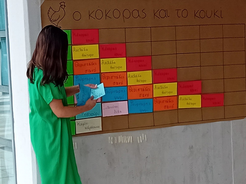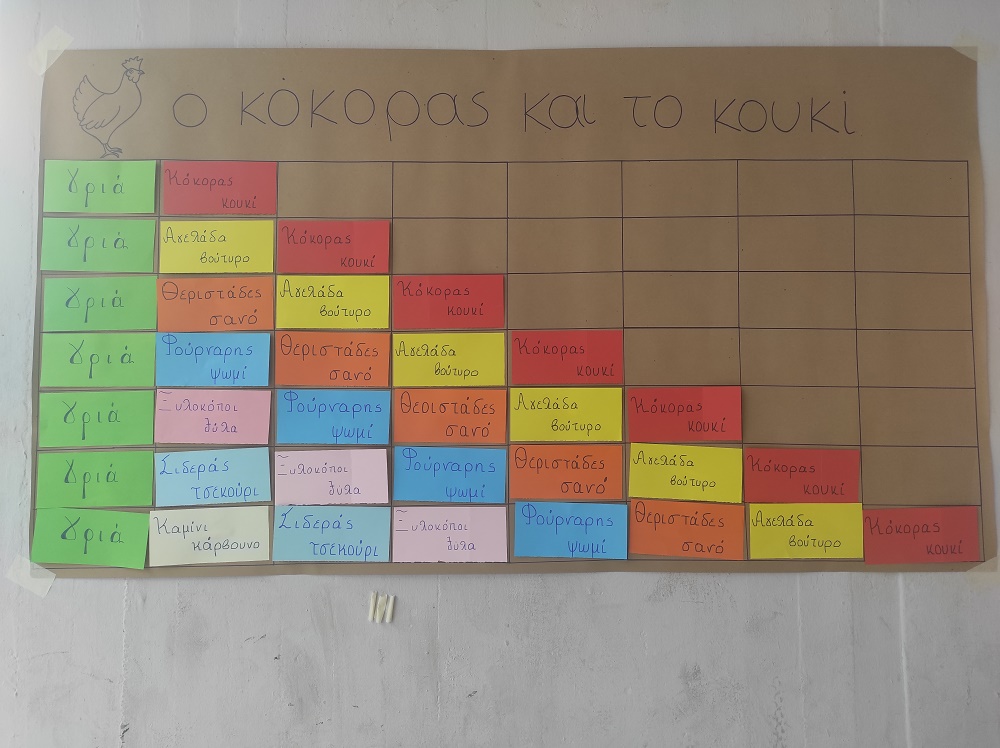 Στην αρχή της δραστηριότητας η Δέσποινα διάβασε με παραστατικότητα το παραμύθι με τον τίτλο «Ο κόκορας και το κουκί». Κεντρικός χαρακτήρας του παραμυθιού μια καλοκάγαθη γριούλα που καταβάλλει αγωνιώδη προσπάθεια να σώσει τον κόκορά της που πνιγότανε από ένα… κουκί! Οι περιπέτειες της ένα σωρό και κάθε φορά που η εμψυχώτριά τις απαριθμούσε όλες, εμφανιζόταν ακόμα μια και το παραμύθι δεν είχε τελειωμό! Η Δέσποινα διάβαζε το παραμύθι ρυθμικά παρακινώντας τα παιδιά να συμπληρώσουν τις φράσεις που επαναλαμβάνονταν, ώστε να καταλάβουν το επαναλαμβανόμενο μοτίβο!