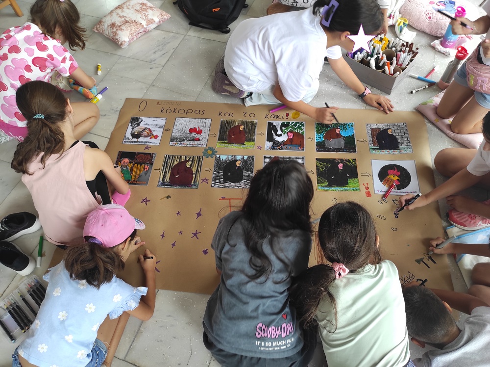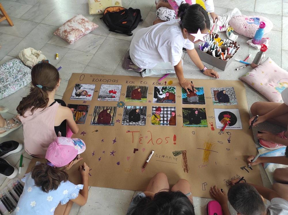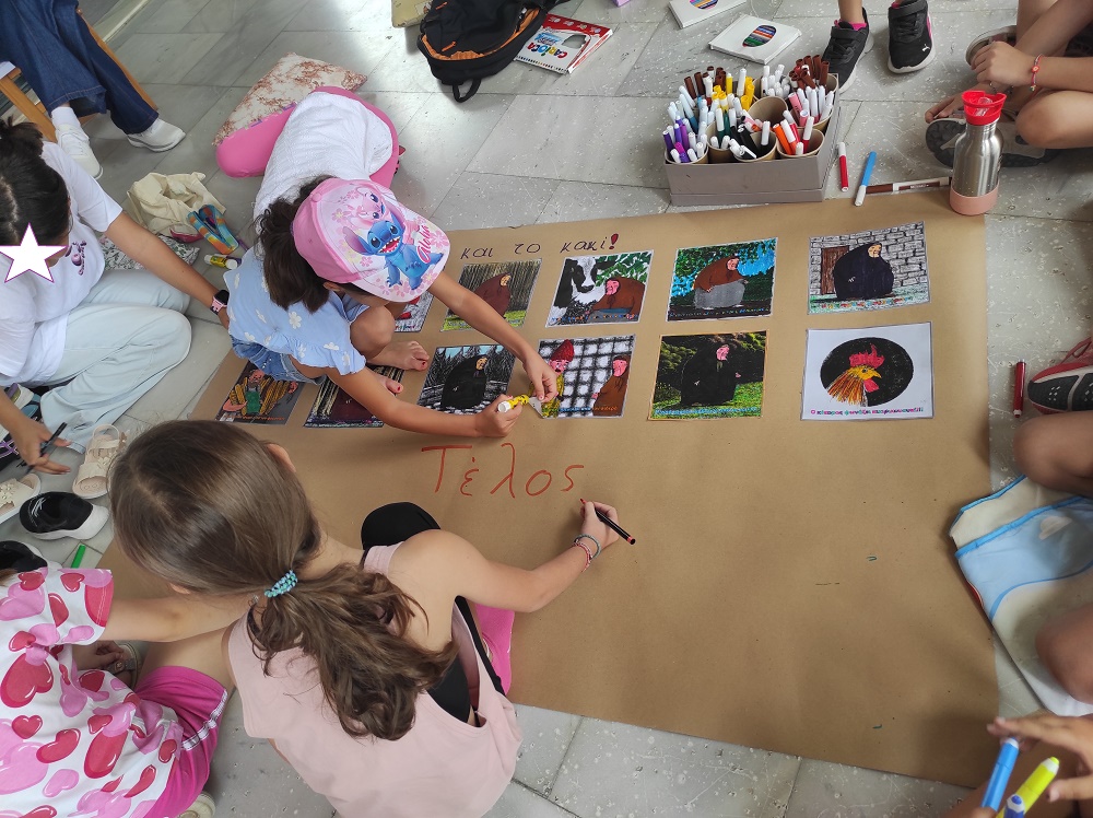 Στην συνέχεια με αυτό το μοτίβο δημιουργήθηκε σε χαρτί του μέτρου μια πολύχρωμη κλίμακα-σκάλα με τα επαναλαμβανόμενα στοιχεία του παραμυθιού μεταμορφώνοντας το σε ένα χρωματικό μοτίβο που πραγματικά έκλεψε την παράσταση! Στη συνέχεια τα παιδιά χωρίστηκαν σε δύο ομάδες και δημιούργησαν κολλάζ με τις εικόνες της ιστορίας, αφού πρώτα τις έβαλαν στη σωστή σειρά. Τα δημιουργήματα τους τα εμπλούτισαν με ζωγραφιές εμπνευσμένες από τις περιπέτειες της ηλικιωμένης ηρωίδας και το αποτέλεσμα της συνεργασίας τους ήταν άκρως εντυπωσιακό!
