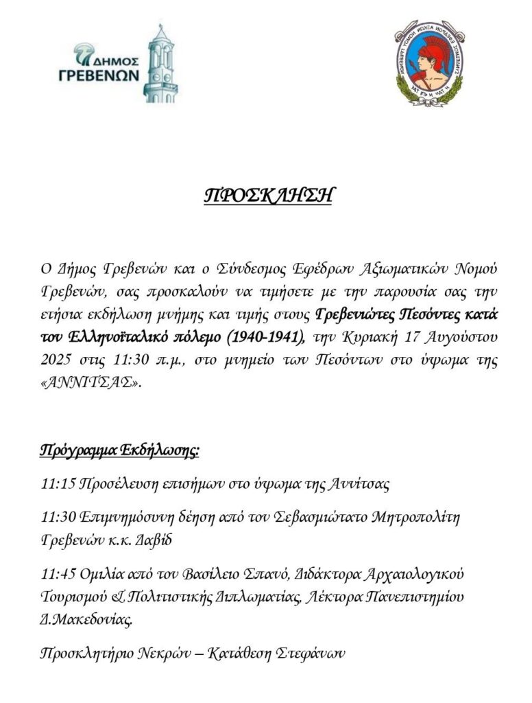 Ο Δήμαρχος Γρεβενών Κυριάκος Ταταρίδης και ο Πρόεδρος του Συνδέσμου Εφέδρων Αξιωματικών Νομού Γρεβενών, σας προσκαλούν στην ετήσια εκδήλωση τιμής και μνήμης για τους Γρεβενιώτες Πεσόντες κατά τον Ελληνοϊταλικό πόλεμο (1940-1941), την Κυριακή 17 Αυγούστου 2025 και ώρα 11:30 στο Μνημείο Υψώματος ΑΝΝΙΤΣΑΣ.
