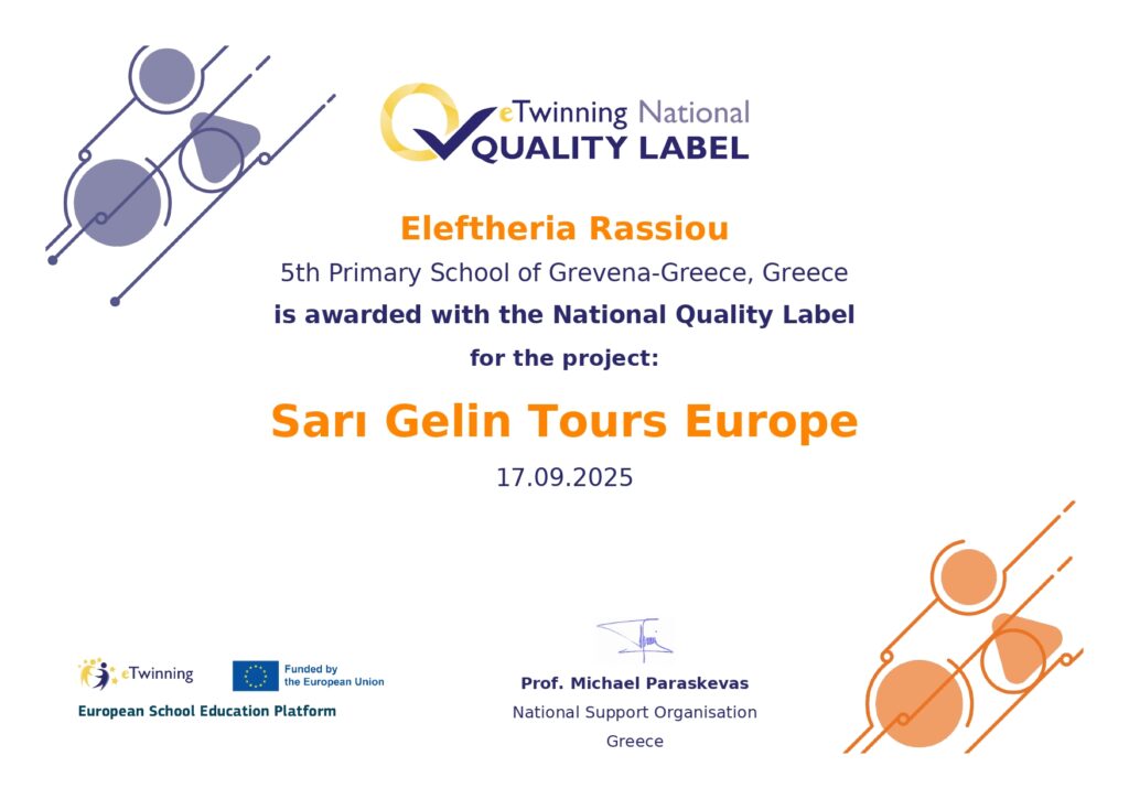 Μεγάλη χαρά επίσης και για την προσωπική Εθνική Ετικέτα Ποιότητας, που έλαβα για τη συμμετοχή μου στο eTwinning έργο “Sari Gelin goes to Europe”, μαζί με μαθητές και εκπαιδευτικούς από την Ιταλία, Ουκρανία, Ρουμανία, Γεωργία και Τουρκία. Θερμές ευχαριστίες στους συναδέλφους Αθηνά Διαμαντή και Θεόδωρο Καλαμπούκα για τη συμβολή τους στο έργο, καθώς και στους μικρούς μαθητές και μαθήτριες της Β’ και Γ’ τάξης για τον ενθουσιασμό, τη συνεργασία και τη δημιουργικότητά τους!
