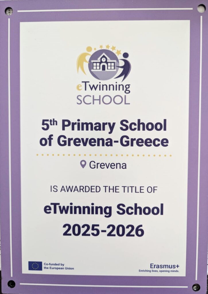 Με μεγάλη υπερηφάνεια το 5ο Δημοτικό Σχολείο Γρεβενών, τιμήθηκε με την πλακέτα eTwinning School Label, η οποία αναγνωρίζει επισήμως τη σχολική μας μονάδα ως eTwinning School. Πρόκειται για μια προσπάθεια τεσσάρων ετών που ολοκληρώθηκε με τον καλύτερο δυνατό τρόπο.