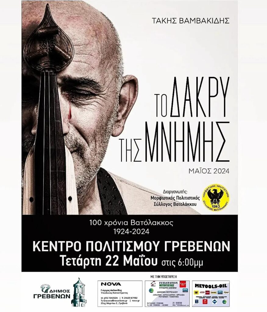 Ενα αφιέρωμα του Μορφωτικού Πολιτιστικού Συλλόγου Βατολάκκου, στην γενοκτονία του Πόντου… Μία εφ’ορου ζωής υποχρέωση να μην κερδίσει η λήθη… Μία οπτικοακουστική παράσταση από τον μοναδικό Τάκη Βαμβακίδη στο κέντρο πολιτισμού του Δήμου Γρεβενών.
