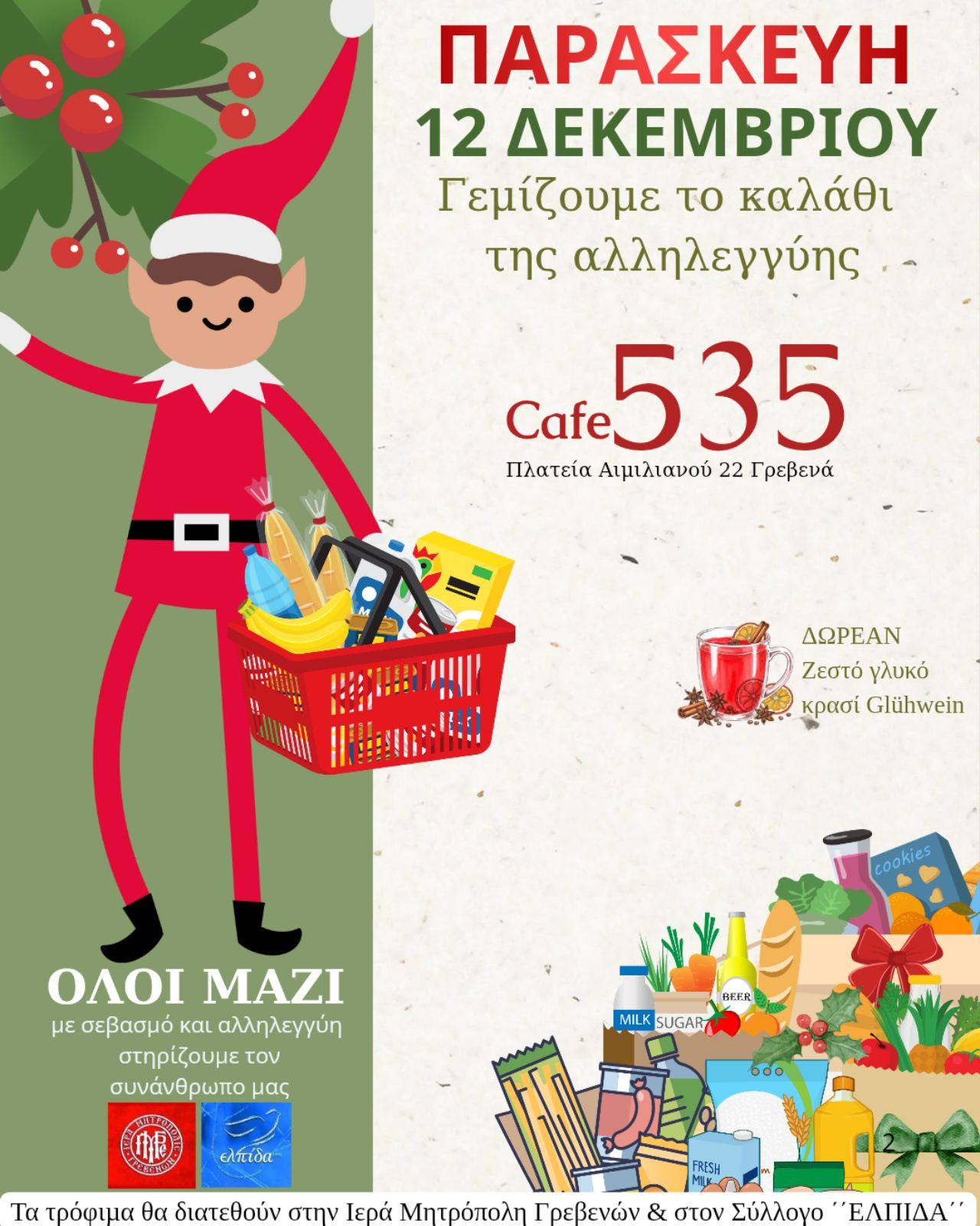 Κεντρικό στοιχείο της γιορτής αποτελεί το «Καλάθι Αλληλεγγύης», μια πρωτοβουλία που έχει γίνει πλέον θεσμός στα Χριστούγεννα του Καφέ 535. Μέσα σε αυτό το καλάθι συγκεντρώνονται τρόφιμα, είδη πρώτης ανάγκης και χριστουγεννιάτικες προσφορές που στη συνέχεια διανέμονται με τις εκδηλώσεις Αγάπης, της Ιεράς Μητρόπολης Γρεβενών και του συλλόγου ¨ΕΛΠΙΔΑ¨.