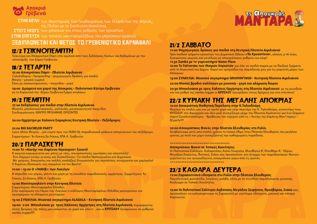 19:00:Δρώμενα και χοροί της Αποκριάς με το Χορευτικό του  Δήμου Γρεβενών