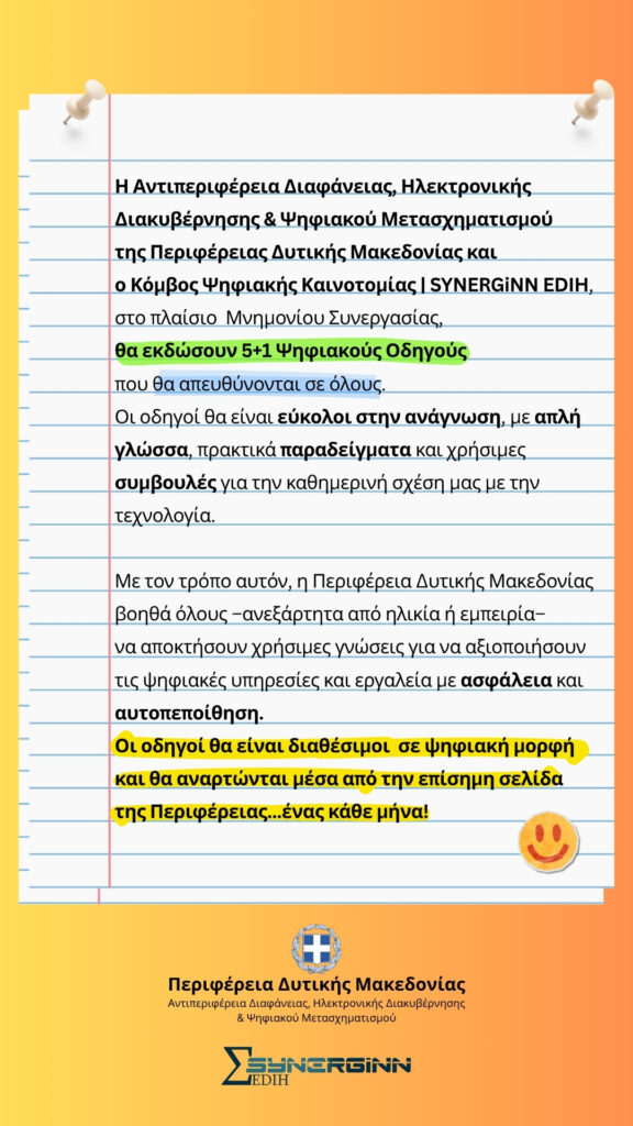 Η Αντιπεριφέρεια Διαφάνειας, Ηλεκτρονικής Διακυβέρνησης & Ψηφιακού Μετασχηματισμού της Περιφέρειας Δυτικής Μακεδονίας και ο Κόμβος Ψηφιακής Καινοτομίας | SYNERGiNNEDIH, στο πλαίσιο Μνημονίου Συνεργασίας, θα εκδώσουν 5+1 Ψηφιακούς Οδηγούς που θα απευθύνονται σε όλους.