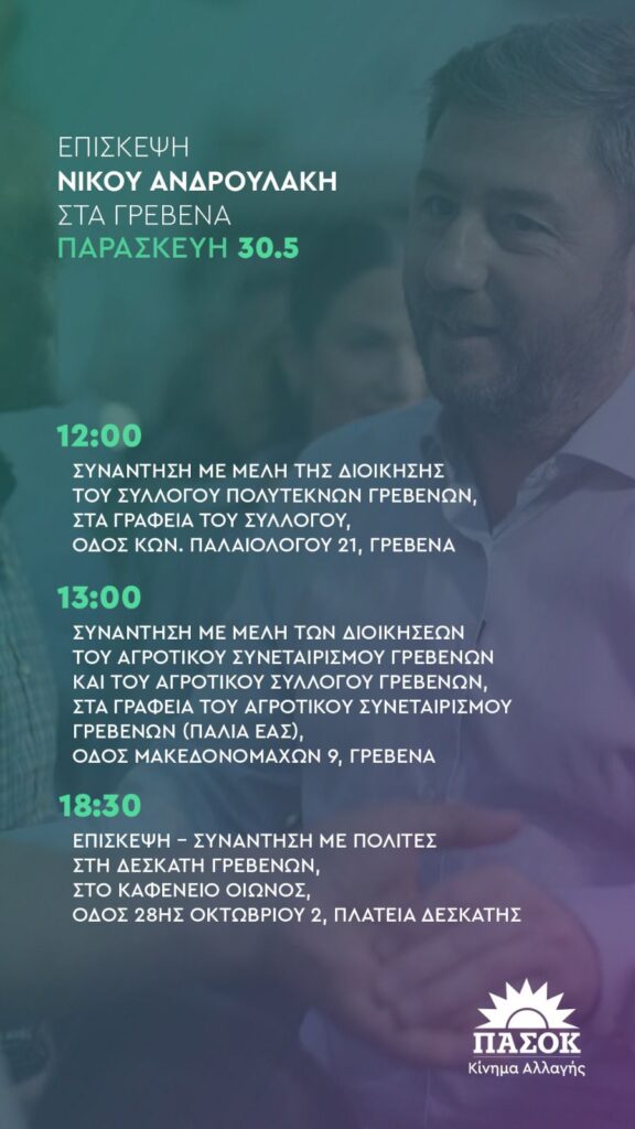 Τα Γρεβενά θα επισκεφθεί την Παρασκευή 30 -5-2025 ο πρόεδρος του ΠΑΣΟΚ Νίκος Ανδρουλάκης. Στις 12:00 μ.μ θα πραγματοποιήσει επίσκεψη στο Σύλλογο Πολυτέκνων και θα συνομιλήσει με μέλη της Διοίκησης, στα γραφεία του Συλλόγου (Παλαιολόγου 21-Γρεβενά). Στις 13:00 μ.μ θα συναντηθεί και θα συνομιλήσει με τα μέλη των Διοικήσεων του Αγροτικού Συνεταιρισμού Γρεβενών και του Αγροτικού Συλλόγου Γρεβενών στα γραφεία του Αγροτικού Συνεταιρισμού(παλιά ΕΑΣ -Μακεδονομάχων 9-Γρεβενά ). Το απόγευμα στις 18:30 μ.μ θα συναντηθεί με πολίτες στη Δεσκάτη Γρεβενών ,στο Καφέ- “ Οιωνός”.( 28ης Οκτωβρίου 2- Κεντρική Πλατεία Δεσκάτης ).