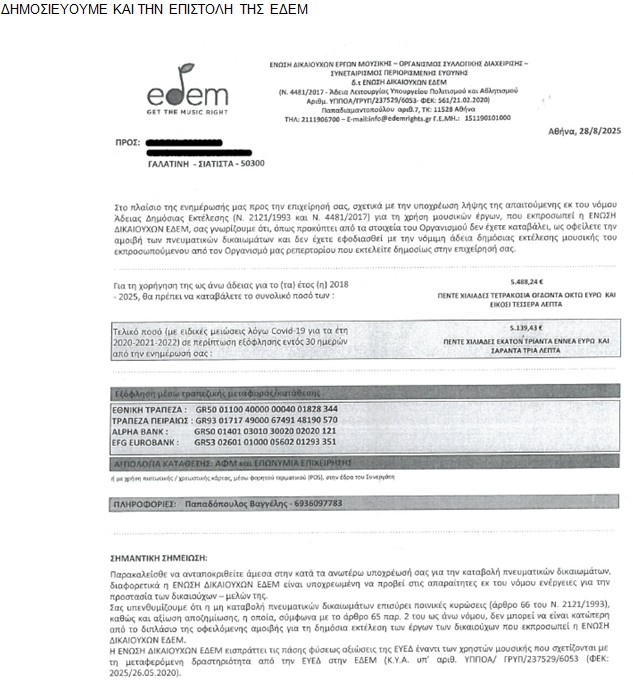 «Αγανάκτηση και οργή σε χιλιάδες συναδέλφους της ΕΣΤΙΑΣΗΣ – ΔΙΑΣΚΕΔΑΣΗΣ – ΞΕΝΟΔΟΧΕΙΑ για τους οργανισμούς πνευματικών και συγγενικών δικαιωμάτων ΕΔΕΜ – ΑΥΤΟΔΙΑΧΕΙΡΙΣΗ – GEA. (ΖΗΤΗΘΗΚΕ από την ΕΔΕΜ το ποσό των 5.488,24 ευρώ σε καφενείο σε χωριό με 30-40 κατοίκους»