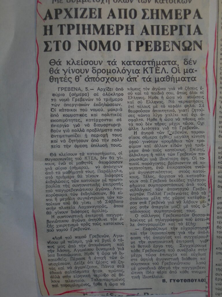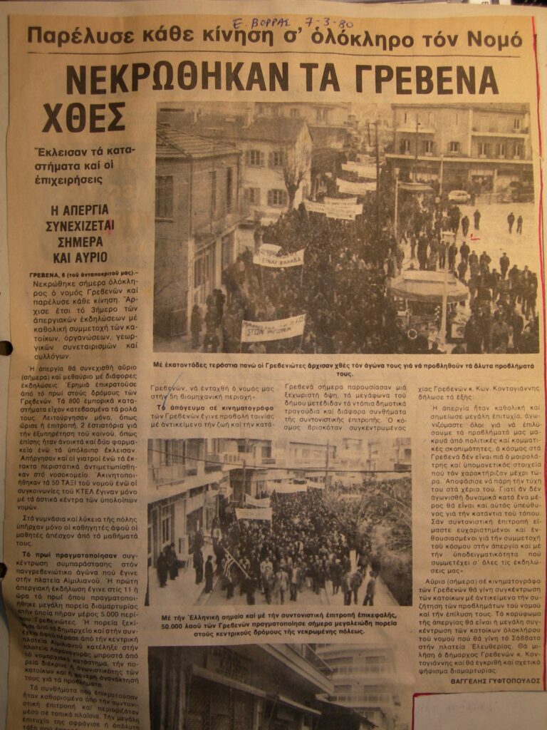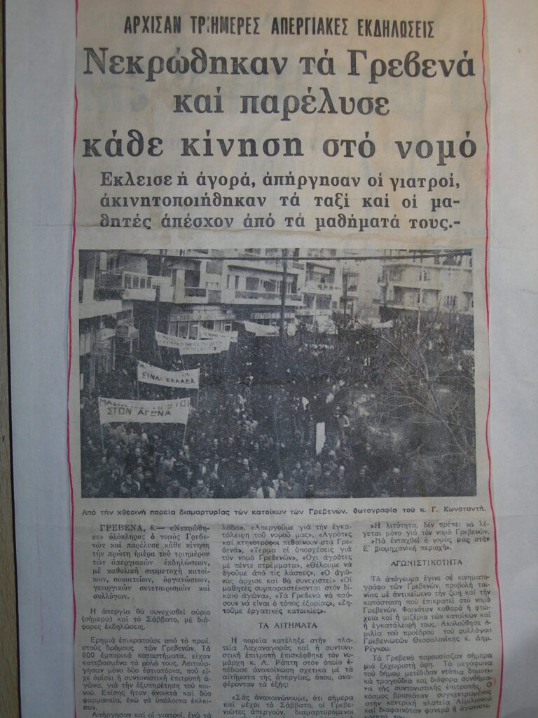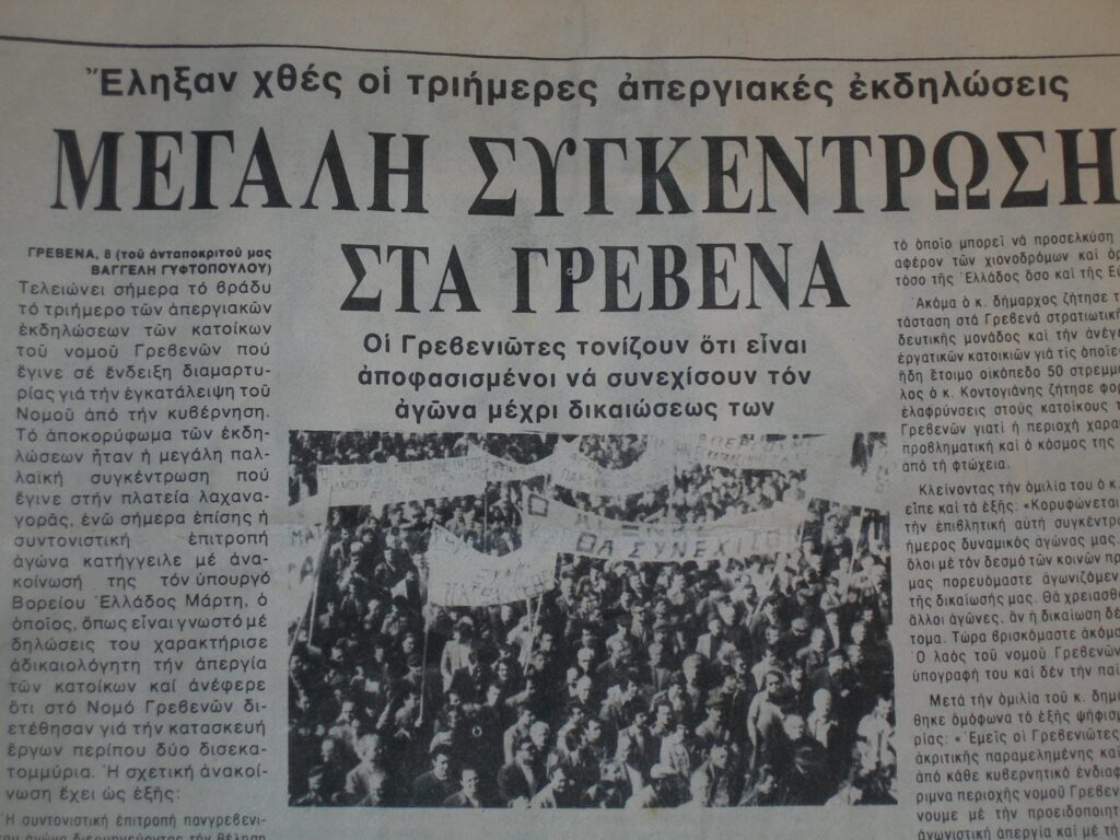 Από τα σημαντικά γεγονότα στην πολιτική Ιστορία των Γρεβενών ήταν και ο γενικός ξεσηκωμός των κατοίκων, γνωστός ως Πανγρεβενιώτικος Αγώνας, με απεργία, συλλαλητήρια, κλείσιμο καταστημάτων, ζητώντας έργα υποδομής για να βγει ο νομός από την απομόνωση και να έχουν οι πολίτες καλύτερες συνθήκες ζωής. Όλα αυτά έγιναν τον Μάρτιο του 1980, μοιάζουν ως ένα πολύ μακρινό παρελθόν, αλλά αποτελούν κομμάτι από την Ιστορία του νομού στα νεότερα χρόνια. Στο τριήμερο 6, 7, 8 Μαρτίου 1980 έγινε καθολική απεργία σε ολόκληρο τον νομό Γρεβενών, με κλειστά καταστήματα, ιατρεία, ιδιωτικές επιχειρήσεις, λεωφορεία, ταξί, πορείες διαμαρτυρίας στους δρόμους των κατοίκων, συγκεντρώσεις, συλλαλητήρια, αποχή μαθητών, έκδοση ψηφισμάτων. Και ο κόσμος δεν ζητούσε πολυτέλειες, αλλά δρόμους για να μην πατάει λάσπες, νοσοκομείο για να γιατρεύονται οι ασθενείς καθώς τότε υπολειτουργούσε και είχε ελλείψεις, δουλειά για να μην φεύγει ο κόσμος. Σε αυτές τις απεργιακές εκδηλώσεις που προκάλεσαν μεγάλη αίσθηση σε όλη την Ελλάδα, γιατί ήταν ο ξεσηκωμός ενός νομού, ίσως είναι από τις λίγες φορές όπου όλοι οι φορείς έβαλαν τα κόμματα στην άκρη και προέταξαν το συμφέρον του τόπου, βλέποντας ότι έφθινε καθημερινά, υστερούσε κατά πολύ σε σχέση με άλλες περιοχές και νομούς.