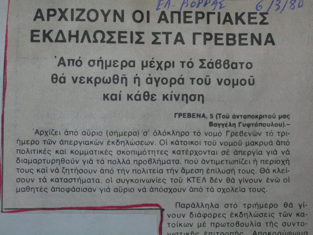 Την Πέμπτη 6 Μαρτίου 1980 έγινε πορεία διαμαρτυρίας στους δρόμους της πόλης με συμμετοχή άνω των 5000 κατοίκων. Ακολούθησε επίδοση ψηφίσματος από την συντονιστική επιτροπή στον τότε νομάρχη Αθανάσιο Ράπτη, προβολή ταινίας για τα προβλήματα του νομού και ομιλίες εκπροσώπων της συντονιστικής επιτροπής στον κινηματογράφο «Αχίλλειον». Το Σάββατο 8 Μαρτίου 1980 έγινε μεγάλη συγκέντρωση στην πλατεία Λαχαναγοράς με κεντρικό ομιλητή τον δήμαρχο Γρεβενών και πρόεδρο της συντονιστής επιτροπής Κωνσταντίνο Κοντογιάννη.