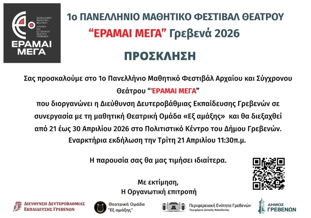 Σας προσκαλούμε στο 1ο Πανελλήνιο Μαθητικό Φεστιβάλ Αρχαίου και Σύγχρονου Θεάτρου “ΈΡΑΜΑΙ ΜΕΓΑ”που θα διεξαχθεί από 21 έως 30 Απριλίου 2026 στο Πολιτιστικό Κέντρο του Δήμου Γρεβενών.