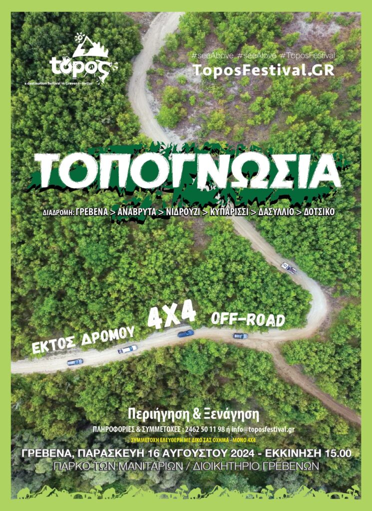 Απαραίτητα όχημα με (4Χ4) τετρακίνηση για τη συμμετοχή σας. Η φετινή διαδρομή ξεκινάει από τα Γρεβενά και διασχίζει > Αναβρυτά > Νιδρούζι > Κυπαρίσσι > Δασύλλιο > Δοτσικό. Πληροφορίες συμμετοχές στο 2462501198 και στο email: info@toposfestival.gr.