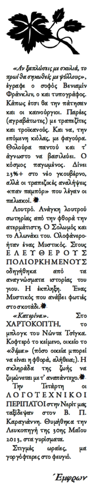 Δημοψήφισμα, «ναι» ή «όχι», μαλώματα, άλλα μέτρα και ποσοστά απειλητικά με το ακρωνύμιο ΦΠΑ. Πλεόνασμα βλακείας, ιδεοληψίες και φωνασκίες. Ανασχηματισμοί, ουρές, κλειστοί οι ναοί του ευρώ. Στεγνώσαμε, φαρμακιασμένος ο ελληνικός αμπελώνας.